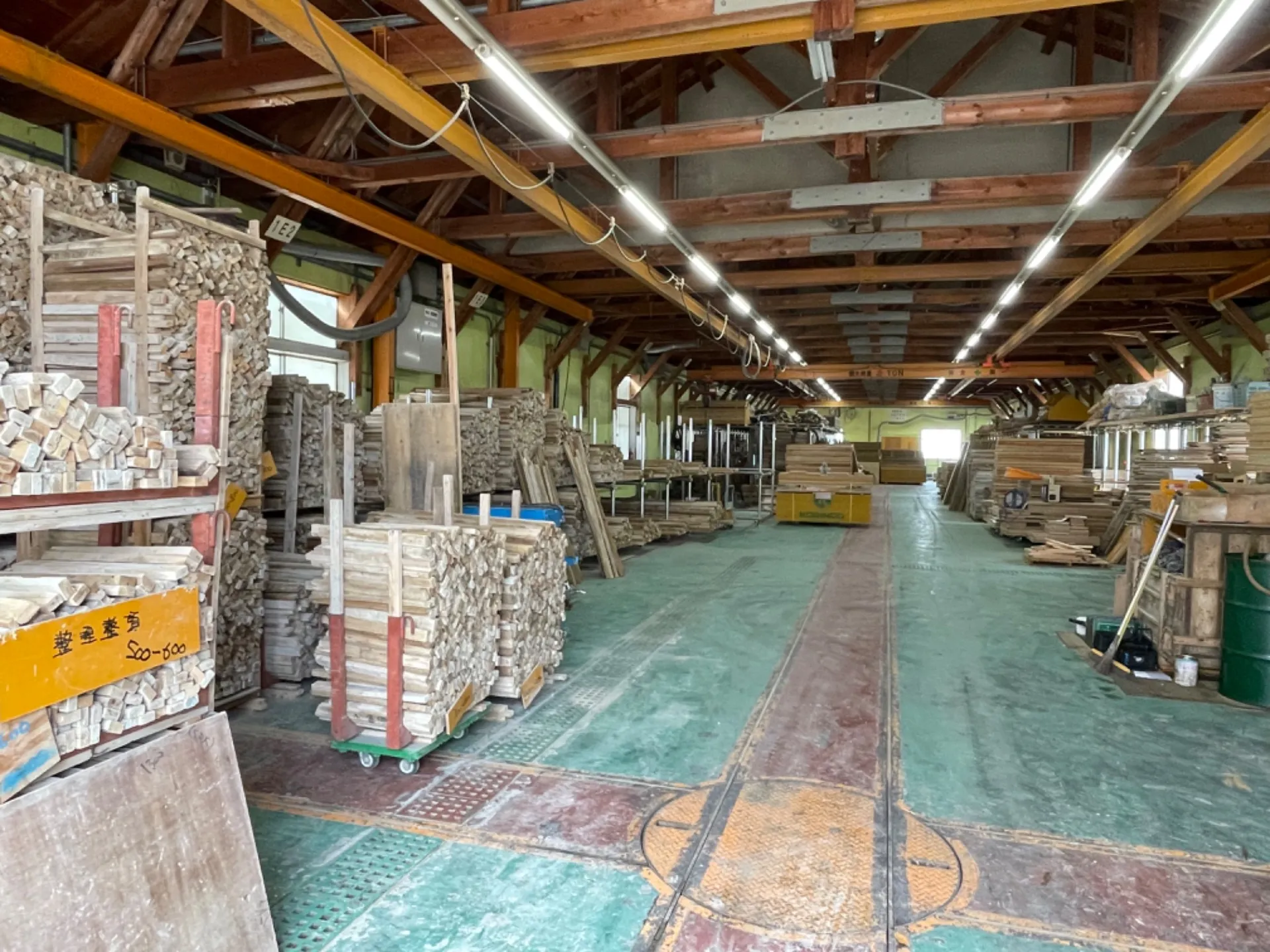 奥には縦引きの製材機が2台、天井クレーンも2台、桟木パネルケレン機、フォークリフト、ハンドリフトもあります。